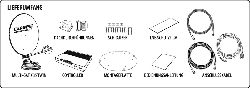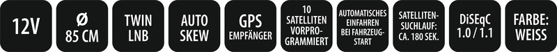 Date tehnice: 10 sateliți preprogramați, frecvență de intrare: 10,7 ~ 12,75 GHz, frecvență de ieșire: 950 ~ 2,150 MHz, polarizare: verticală și orizontală, înălțime unghiulară: 0°~145°, azimut unghiular: 390°, alimentare: DC 12 Volt, temperatura de funcționare: -20° C.