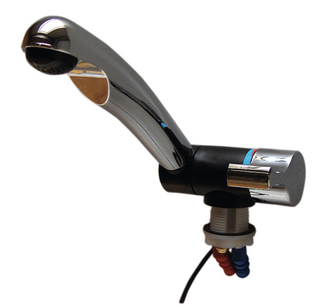 Cu duza curbata rotativa si pivotanta, pentru apa calda si rece.